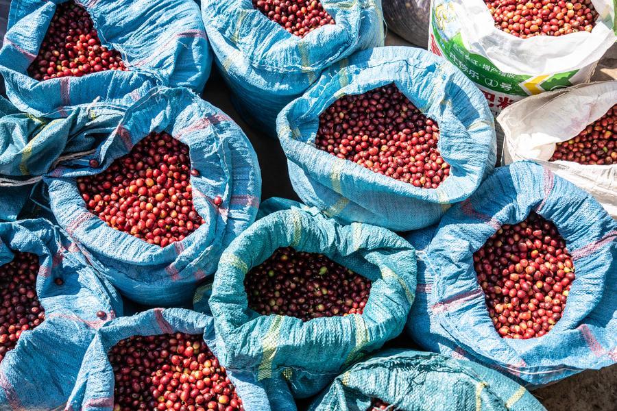 22日、臨滄市臨翔區圏內郷の雲佳コーヒー農園で袋に入ったコーヒーチェリー。(臨滄=新華社記者/高咏薇)