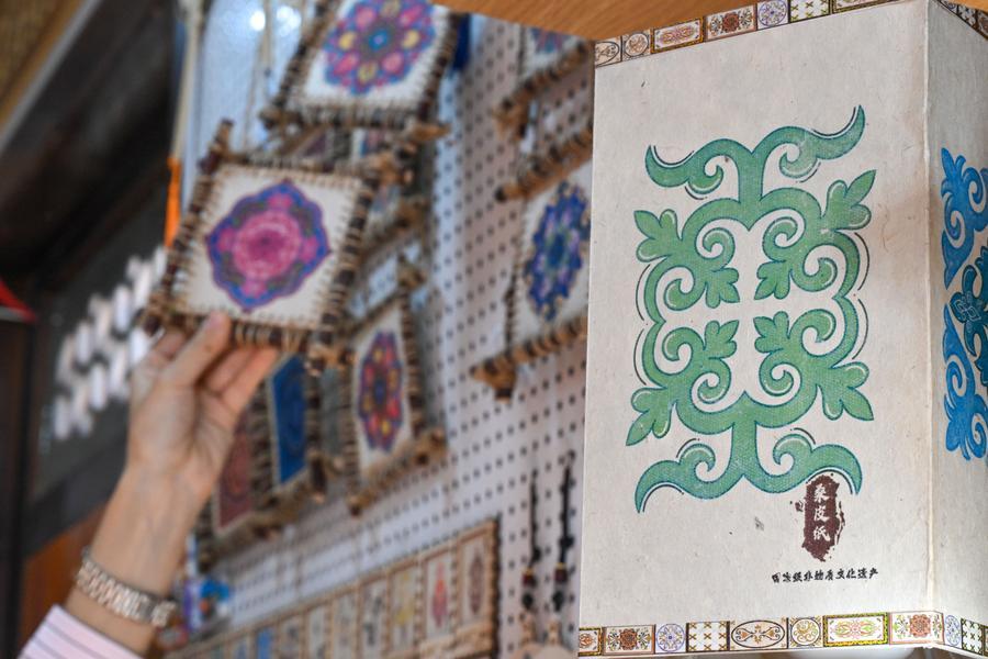 13日、墨玉県の桑皮紙産業パークにあるムエセル・アへマトトフティさんのアトリエで展示された桑皮紙の文化クリエーティブ製品。(墨玉=新華社記者/丁磊)