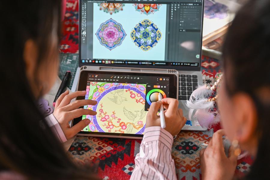13日、墨玉県の桑皮紙産業パークにあるアトリエで、桑皮紙の文化クリエーティブ製品の図柄をデザインするムエセル・アへマトトフティさん(左)。(墨玉=新華社記者/丁磊)