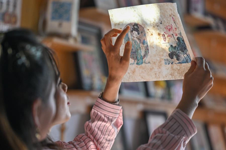 13日、墨玉県の桑皮紙産業パークで、亀茲石窟壁畫の文様を桑皮紙の文化クリエーティブ製品に手描きするムエセル・アへマトトフティさん。(墨玉=新華社記者/丁磊)