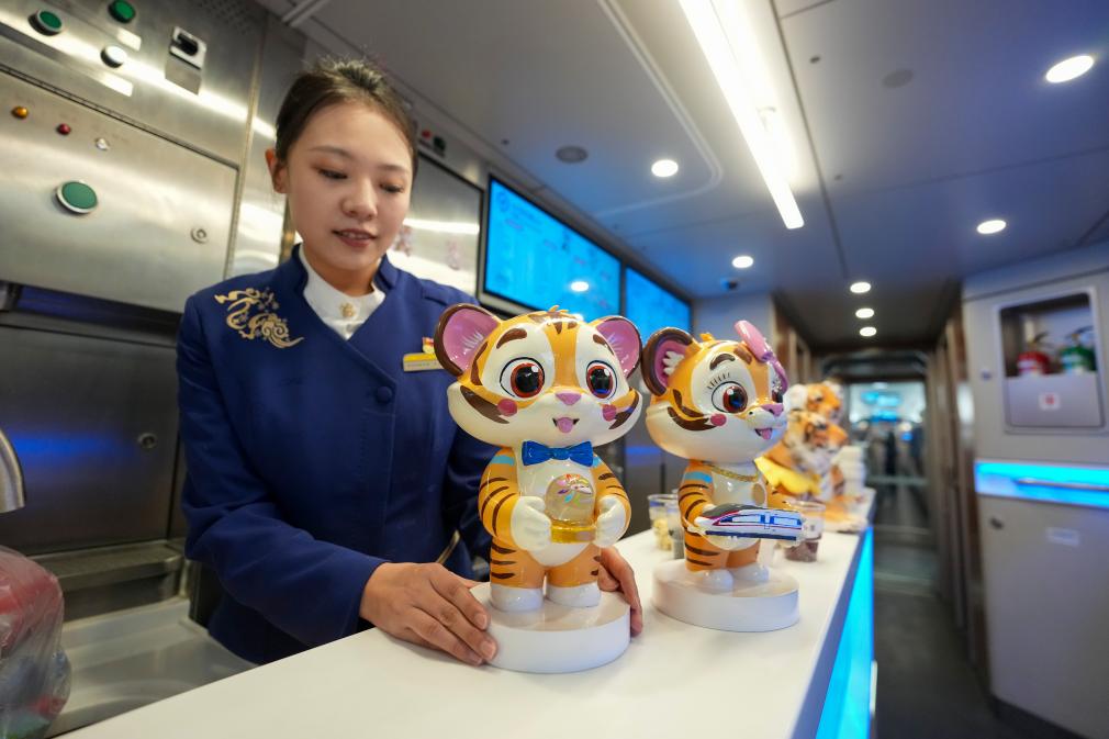 22日、G902號の車內で東北虎(アムールトラ)のグッズを並べる乗務員。(ハルビン=新華社記者/王松)