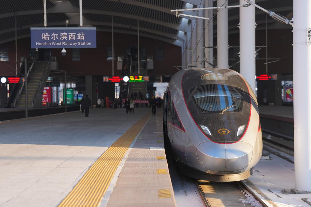 22日、ハルビン西駅に停車するG902號。(ハルビン=新華社記者/王松)