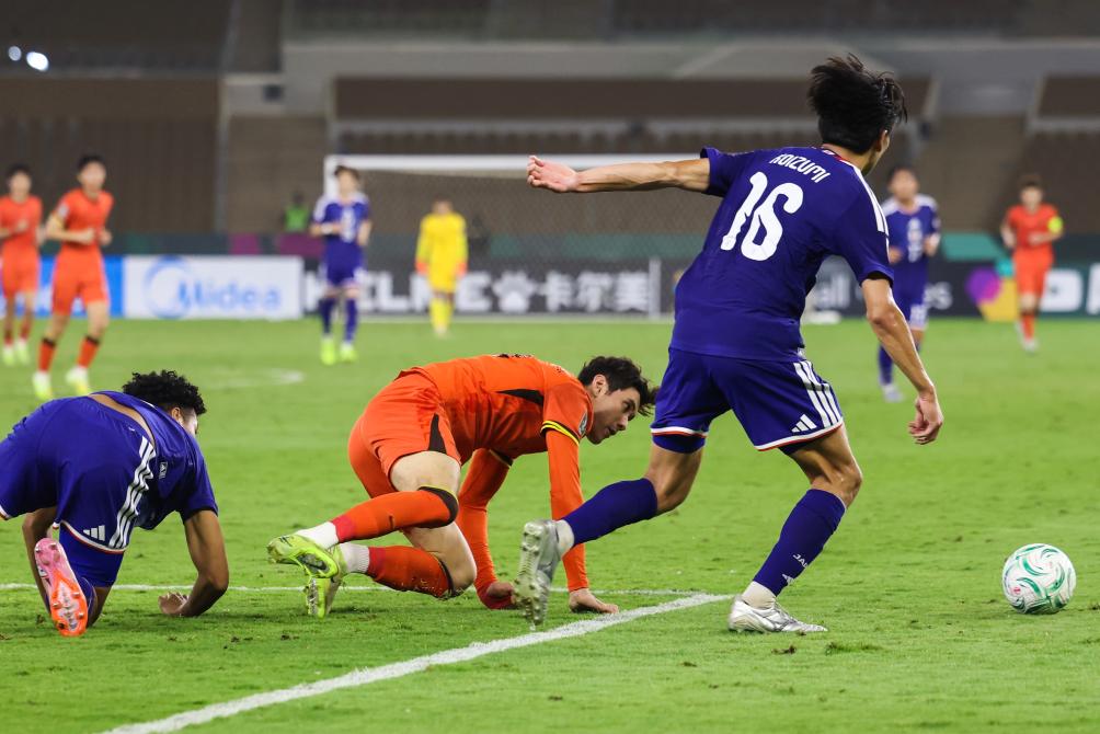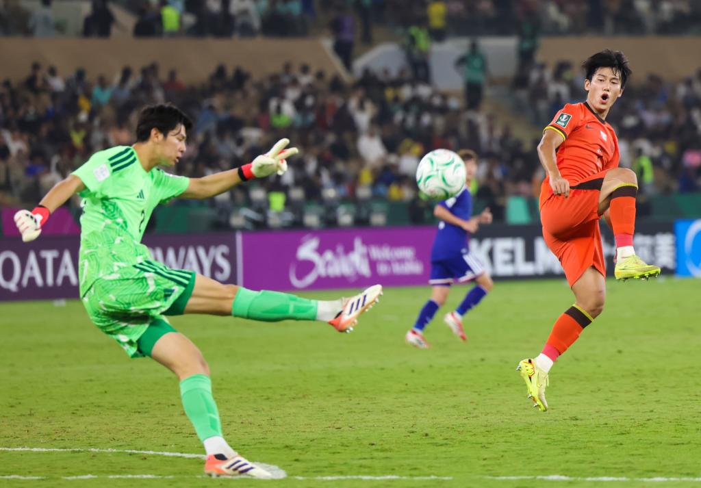 24日、試合に臨む中國の向余望(こう・よぼう、右)と日本のゴールキーパー荒木琉偉。(ジッダ=新華社記者/王海洲)