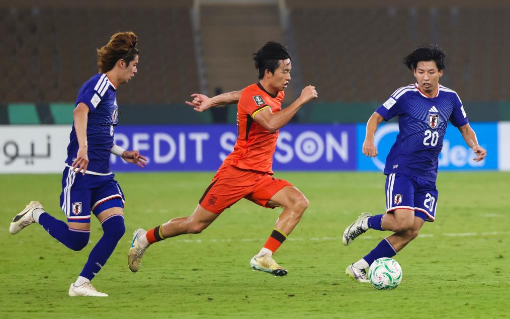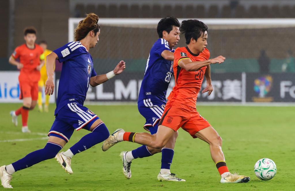 24日、ボールを奪い合う中國の李鎮全(り・ちんぜん、右)と日本の古谷柊介(中央)。(ジッダ=新華社記者/王海洲)