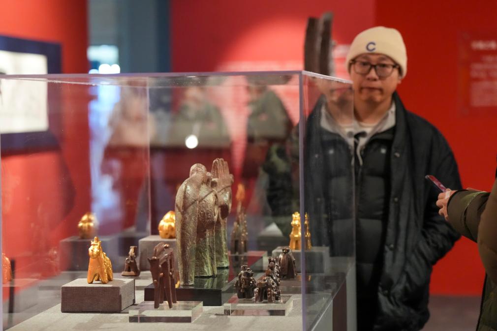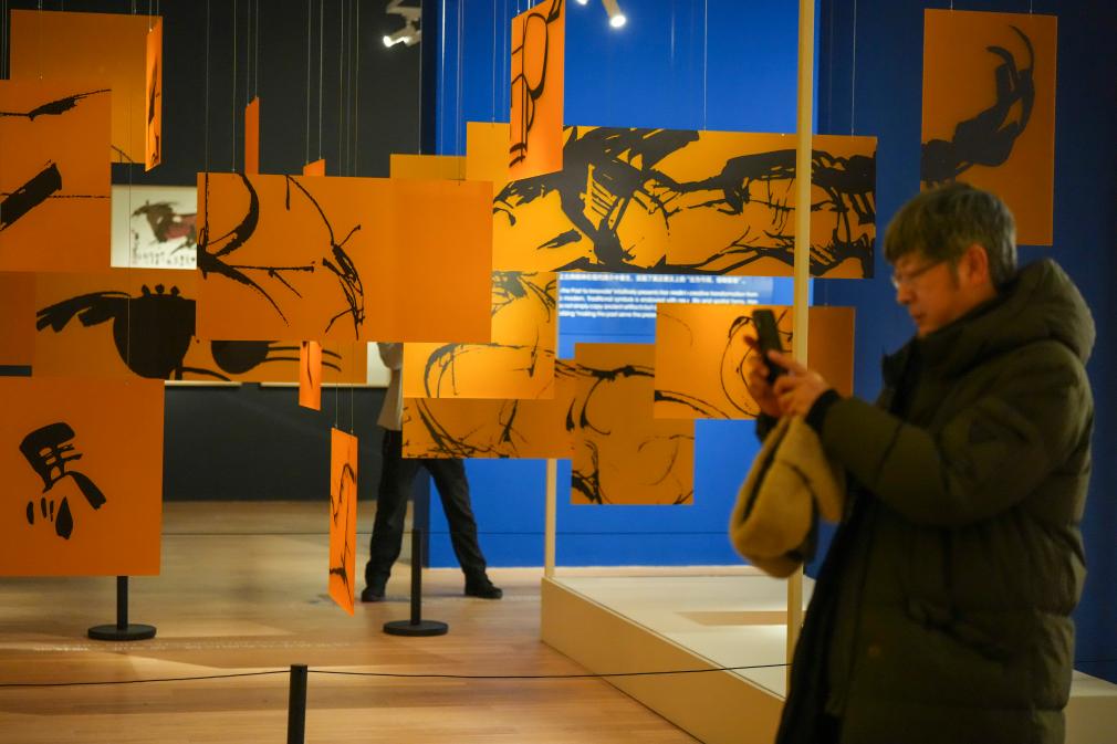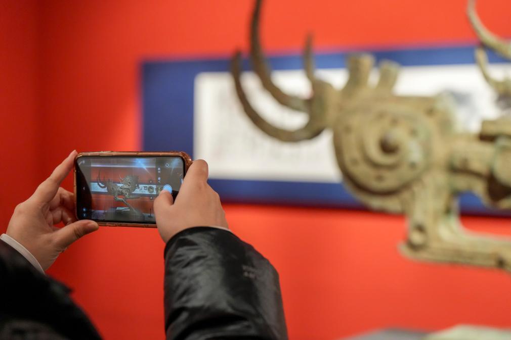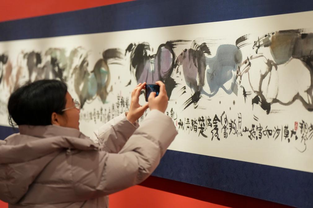 22日、ハルビン市博物館で韓美林馬年蕓術展の展示品を撮影する來館者。(ハルビン=新華社記者/王松)