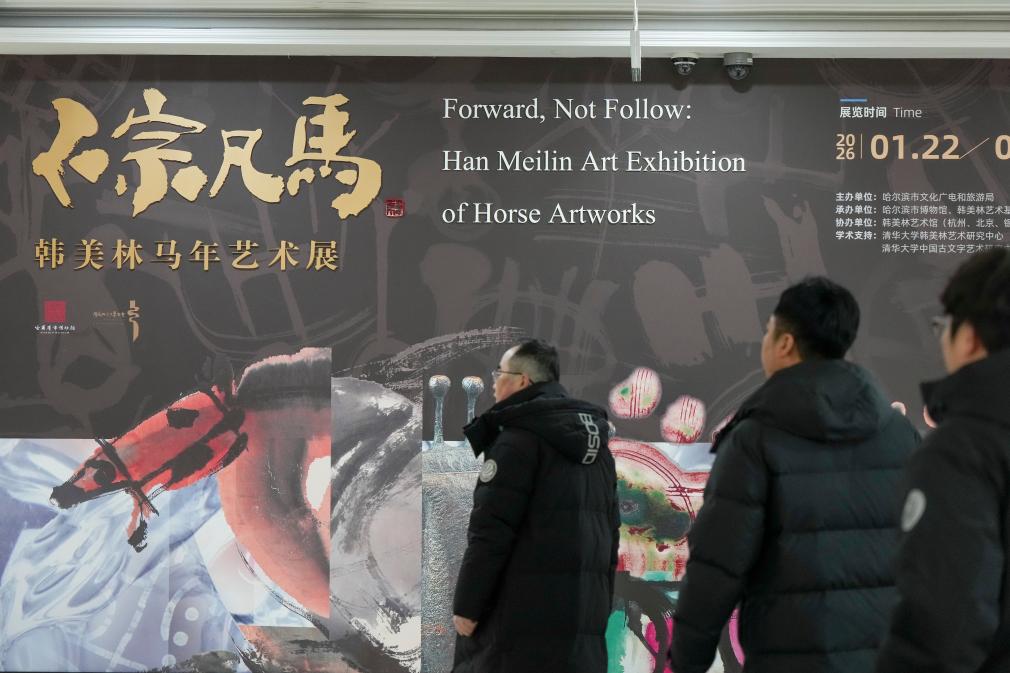 22日、ハルビン市博物館で韓美林馬年蕓術展を見學する來館者。 (ハルビン=新華社記者/王松)