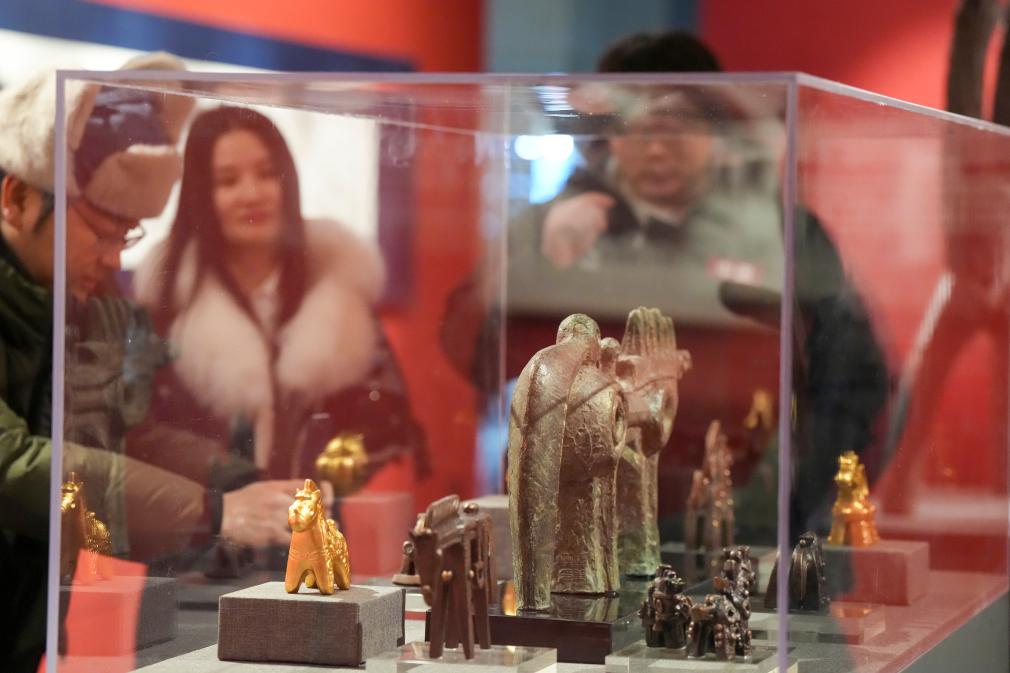 22日、ハルビン市博物館で韓美林馬年蕓術展を見學する來館者。(ハルビン=新華社記者/王松)
