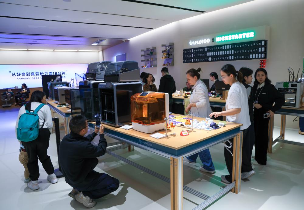 18日、深圳市南山區にあるINNO100世界イノベーション旗艦店の「萬物カスタマイズワークステーション」で、3Dプリンターの動作を見つめる客。(深圳=新華社記者/毛思倩)