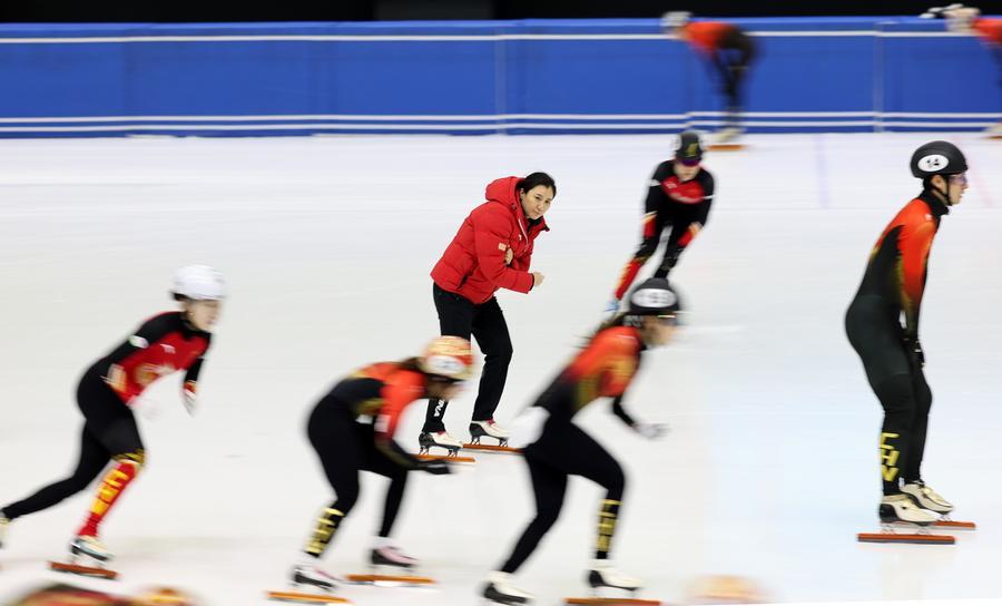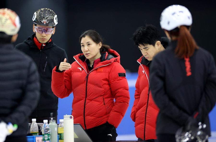 29日、総合トレーニング施設「氷壇」で、スピードスケート・ショートトラック中國代表を指導する張晶監督(中央)。(北京=新華社記者/張晨)