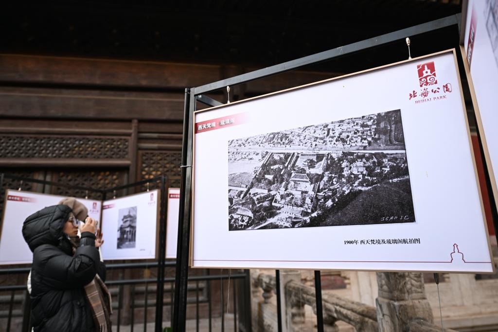 22日、琉璃閣院落の引き渡し式後、北海公園の「西天梵境」で歴史寫真展を鑑賞する出席者。(北京=新華社記者/陳鍾昊)