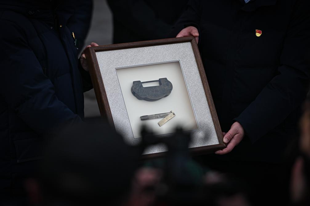 22日、琉璃閣院落の引き渡し式で行われた鍵の贈呈。(北京=新華社記者/陳鍾昊)