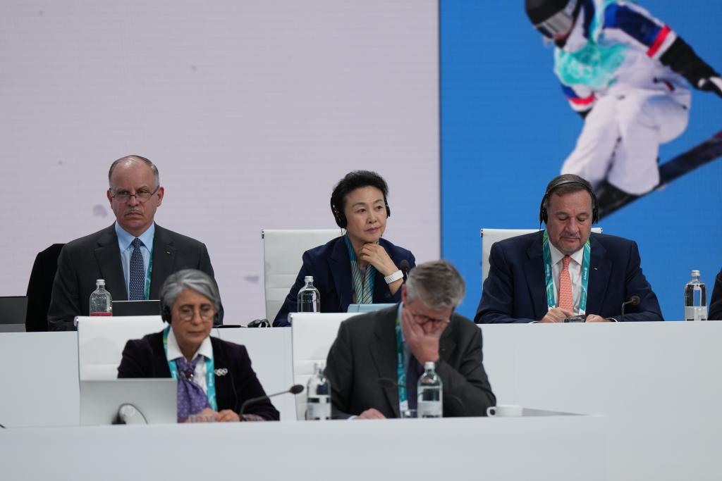 3日、総會に臨むIOCの李玲蔚(り・れいい)委員(後列中央)。(ミラノ=新華社記者/孫非)