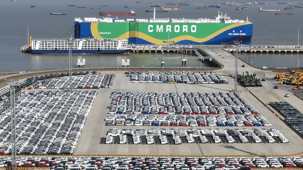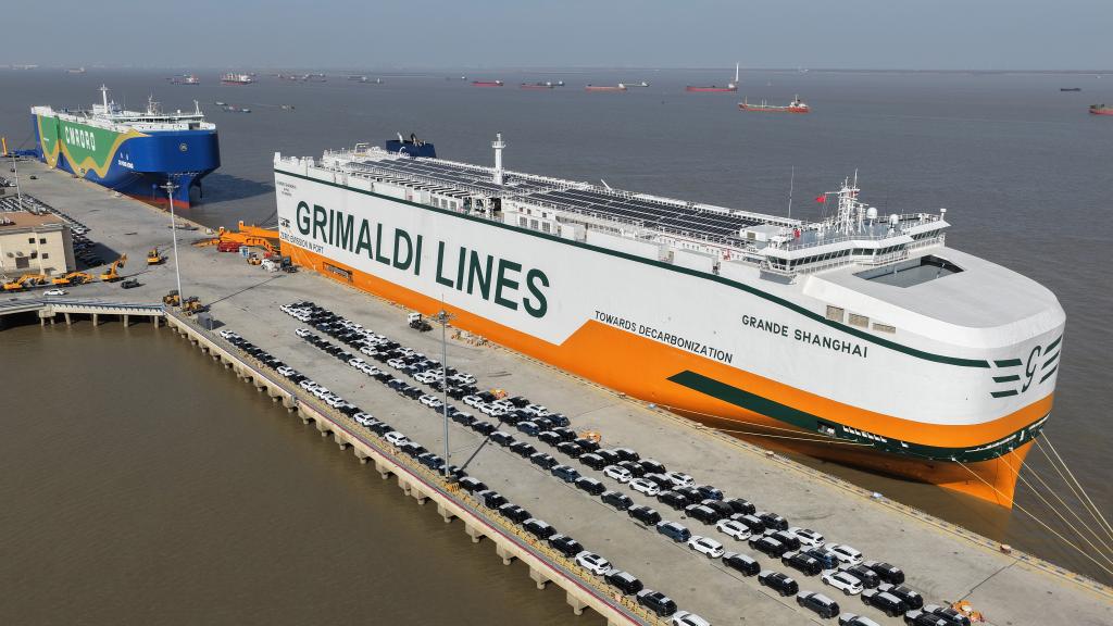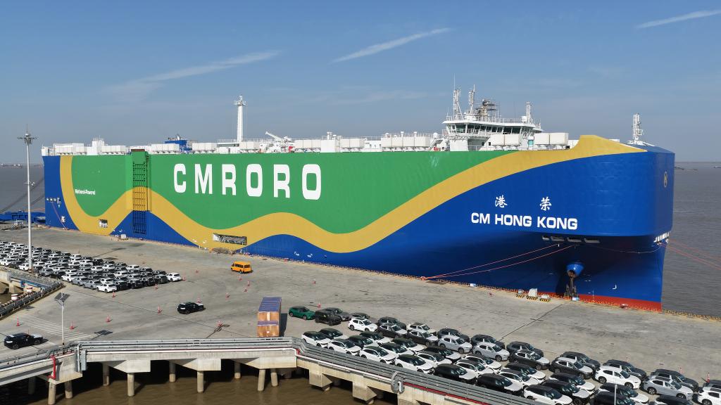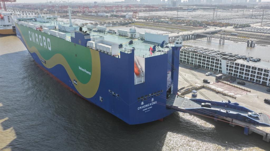 12月9日,在江蘇省蘇州港太倉港區,“港榮”號甲醇雙燃料動力滾裝船在裝載出口汽車(無人機照片)。