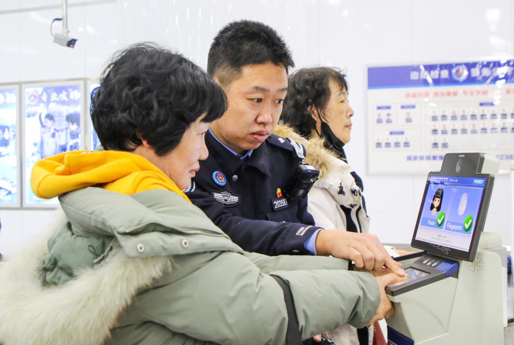 12月28日,在江蘇連雲港港國際客運站入境大廳,連雲港&&境邊防檢查站民警協助韓國游客採集指紋。