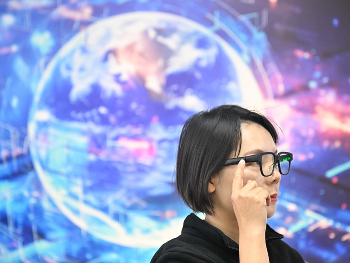 2025年12月4日,在“AI·鏡界—南京人工智能生態街區”,工作人員展示一款AI眼鏡。新華社記者 季春鵬 攝