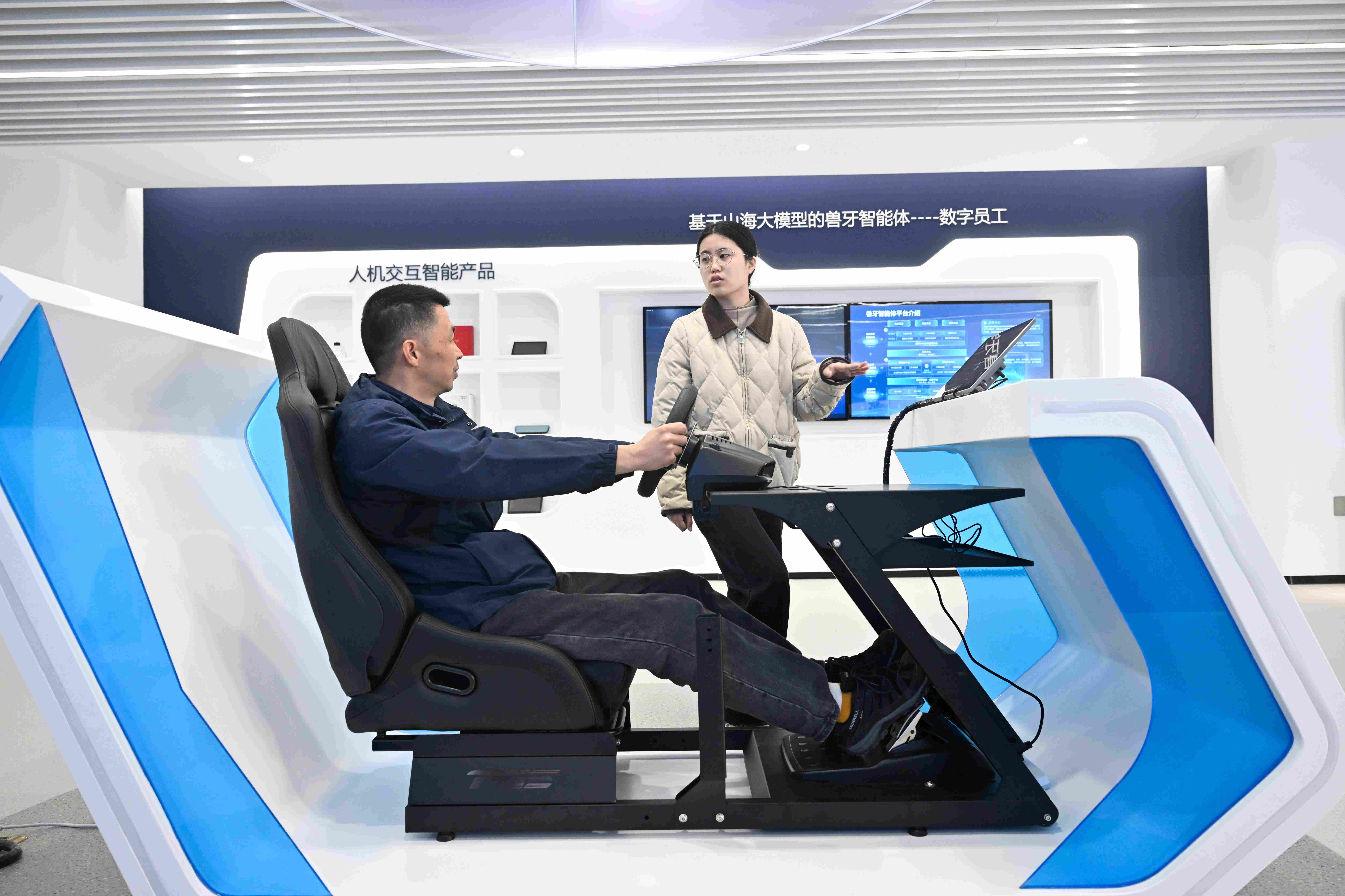 2025年11月28日,在江蘇雲知聲科技有限公司,工作人員(右)介紹一款車載人機交互智能産品。新華社記者 季春鵬 攝