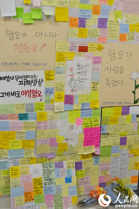 民眾在首爾地鐵江南站、首爾市政府大樓及各高校內張貼哀悼的話語。 成碩攝