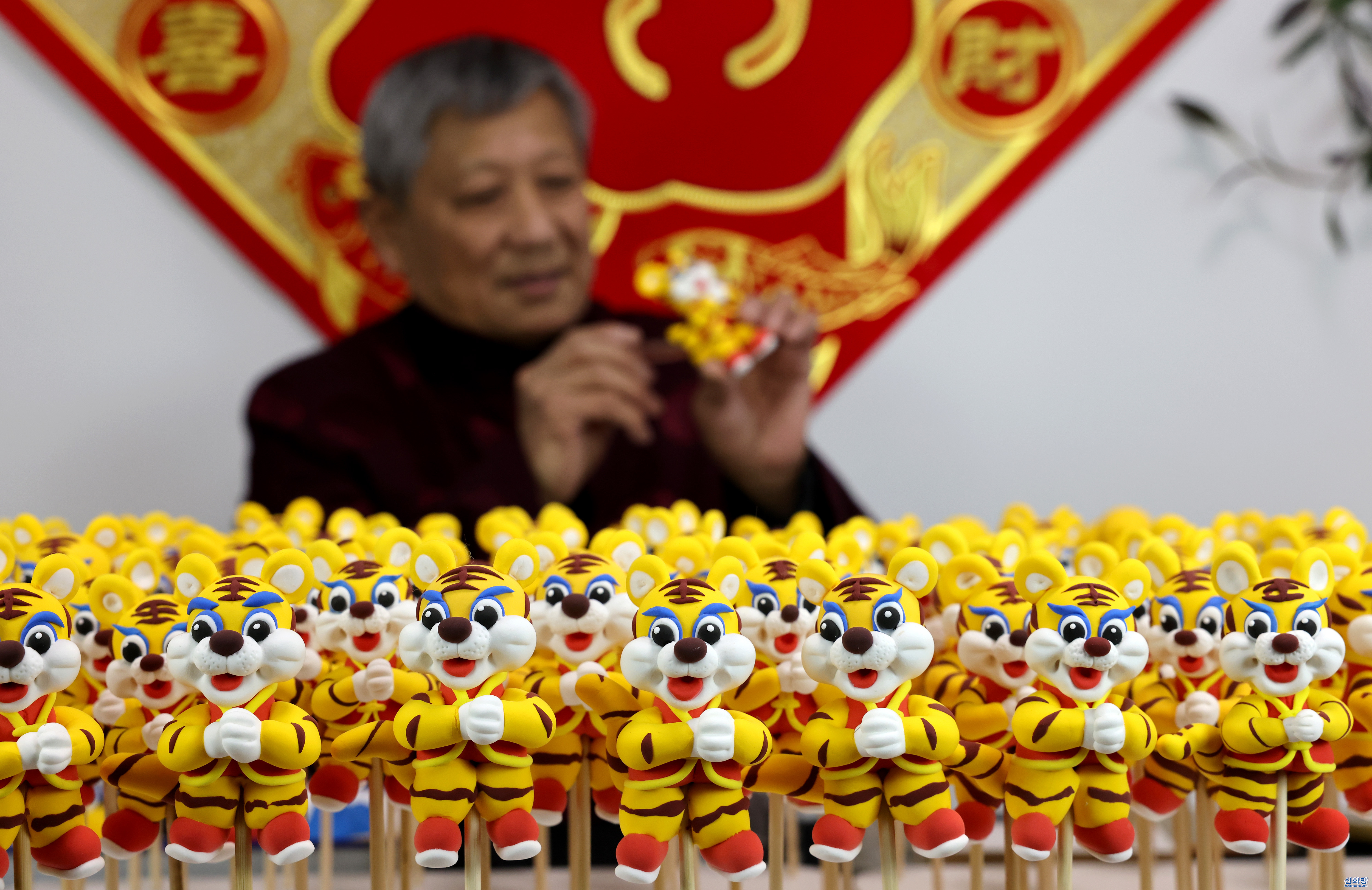 1월16일 산둥(山東)성 짜오좡(棗莊)시의 민간예술가인 칸쭝친(闞宗勤) 씨가 자택에서 몐쑤(面塑·물들인 찹쌀가루를 반죽해 인물이나 동물의 형상을 빚는 중국의 전통 민속공예) 작품을 선보였다.음력 호랑이의 해를 앞두고 민간예술가들이 호랑이를 소재로 한 여러 가지 몐쑤 작품을 선보였다. [촬영/신화사 기자 쑨중저(孫中喆)]