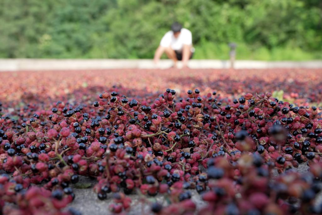 [신화망 친황다오 8월28일] 농민이 26일 허베이(河北)성 친황다오(秦皇島)시 하이강(海港)구의 한 마을에서 수확한 산초 열매를 말리고 있다.