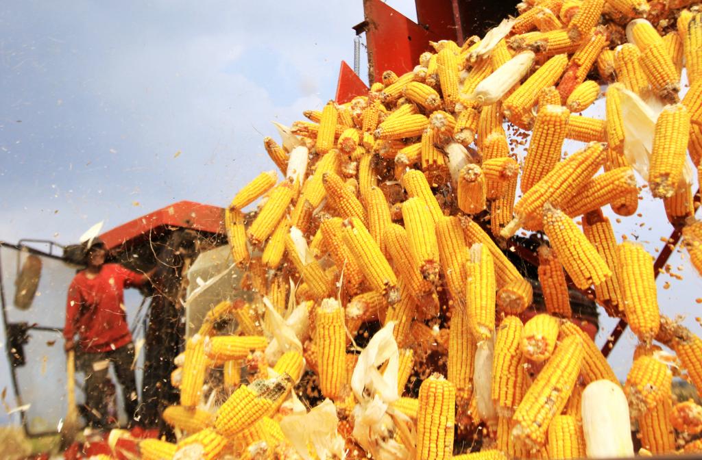 산둥(山東)성 린이(臨沂)시의 한 마을 농민들이 18일 수확한 옥수수를 트럭에 싣고 있다. 2023.9.18
