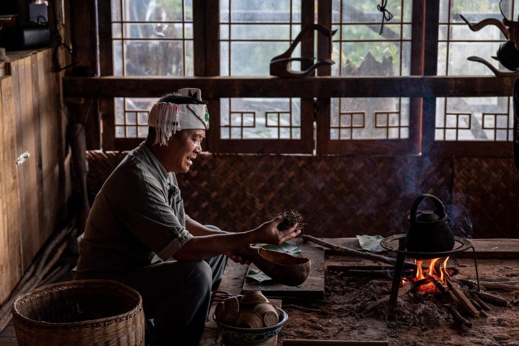 14일 징마이산 부랑궁주(公主)차 공장에서 부랑족 주민인 예샹(葉香)이 손님에게 줄 차를 우려내고 있다. (사진/신화통신)