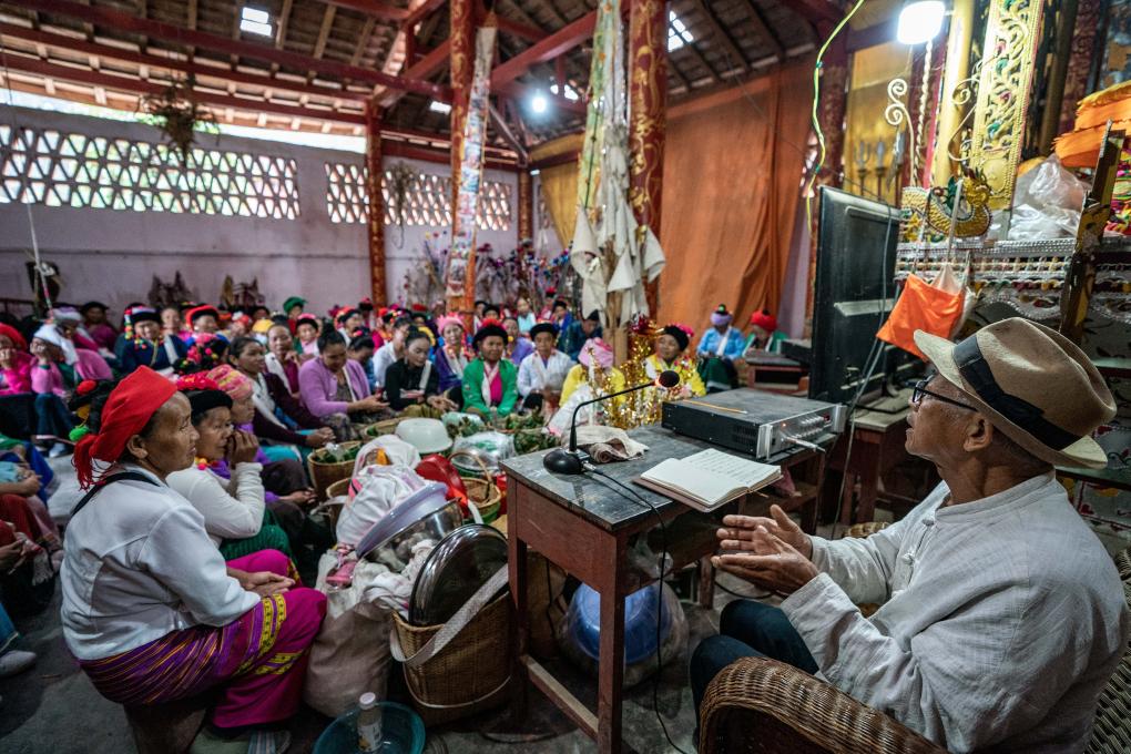징마이산 망징촌 문화활동실에서 여든에 가까운 부랑족 노인 쑤궈원(蘇國文∙오른쪽)이 14일 주민들에게 생태 및 문화 보호 지식을 소개하고 있다. (사진/신화통신)