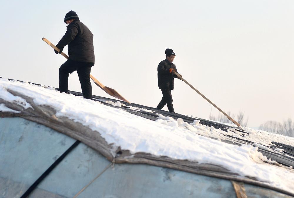 [신화망 스자좡 12월19일] 허베이(河北)성 스자좡(石家莊)시 위안스현 난쭤(南佐)촌 재배 농가에서 18일 비닐하우스 위에 쌓인 눈을 치우고 있다.