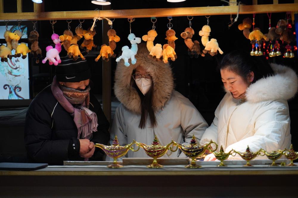 [신화망 둔황 1월23일] 간쑤(甘肅)성 둔황(敦煌)시의 야시장을 방문한 여행객이 21일 기념품을 구매하고 있다.