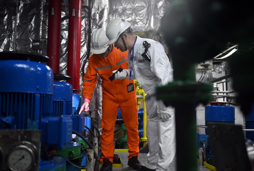 [신화망 하이커우 1월23일] 22일 하이커우(海口) 신하이(新海)항에서 여객·화물 겸용 운반선 로팩스(Ro-Pax)의 기내 설비를 점검하는 안전검사관.