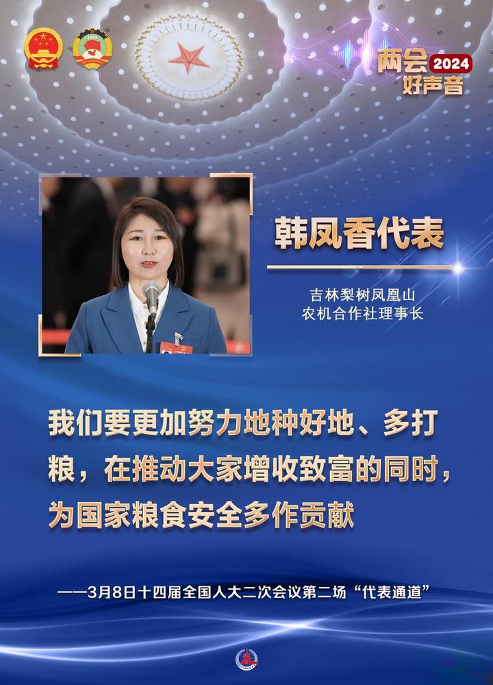 전인대 대표인 왕융청(王永澄) 푸젠(福建)성 장애인연합회 겸직부이사장은 "우리 장애인들의 목소리를 전인대에 가져왔을 뿐만 아니라 중국공산당과 인민의 관심과 사랑을 수많은 장애인에게 전달할 것"이라고 말했다.전인대 대표인 황리(黃立) 우한(武漢) 가오더(高德)적외선회사 회장은 "하이테크 기업으로서 앞으로도 꿈을 실현할 수 있는 프런티어 기술을 끊임없이 연구개발할 것"이라고 밝혔다.전인대 대표인 판셴췬(范先群) 상하이교통대학 부총장은 "지금의 중국 청년은 정말 강하다"면서 "그들의 지식과 능력은 과거 우리의 수준을 크게 넘어섰다"고 강조했다.전인대 대표인 천쥔(陳軍) 난카이(南開)대학 부총장은 "전기차가 더 멀리∙더 빨리 달릴 수 있도록 더 좋은 성능의 더 안전한 배터리를 계속 연구∙생산할 것"이라고 포부를 드러냈다. 전인대 대표인 한펑샹(韓鳳香) 지린(吉林) 리수(梨樹) 펑황산(鳳凰山)농업기계합작사 이사장은 "소득 증대와 부의 창출을 추진하는 동시에 국가 식량 안보에 더 많이 공헌할 수 있도록 농사를 짓고 식량 생산량을 늘리는 데 더욱 힘쓸 것"이라고 밝혔다. 전인대 대표인 웨차오윈(岳巧雲) 베이징 뤼눙싱윈(綠農興雲)합작사 이사장은 "주민들과 함께 복숭아를 잘 키우고 거기에 과학기술을 접목해 향촌 진흥에 기여할 것"이라고 힘줘 말했다.