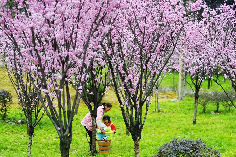 [신화망 충칭 3월18일] 17일 충칭(重慶)시 유양(酉陽)투자(土家)족먀오(苗)족자치현 소재 공원에 나들이 나온 관광객.