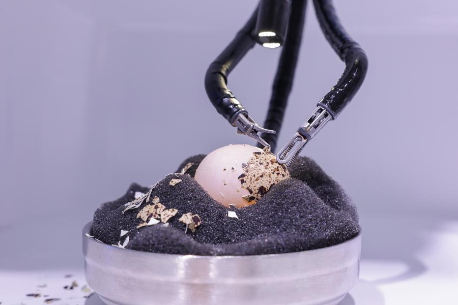 수루이의 로봇 생산 작업장에 들어서자 유연한 기계팔로 계란 껍데기를 벗기고 있는 수술 로봇이 눈길을 끈다. 껍데기 두께가 약 0.17㎜인 직경 2~3㎝의 메추리알을 수술 로봇이 손쉽고 깨끗하게 벗겨낸다.