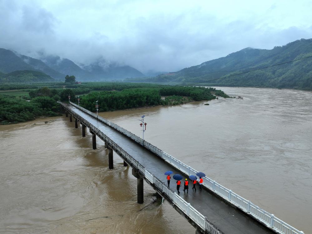 푸젠(福建)성 젠어우(建甌)시 홍수 예방 관계자가 17일 츠커우(慈口)촌 대교에서 강물 수위를 살펴보는 모습을 드론 사진에 담았다. 2024.6.17