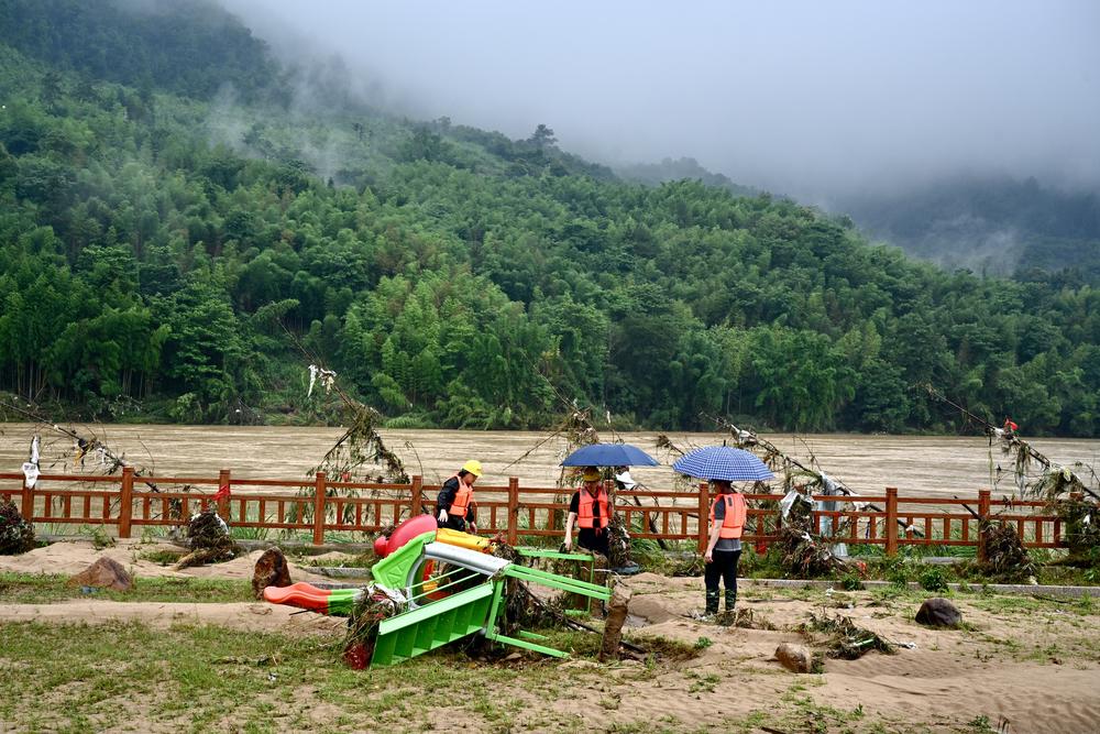 [신화망 베이징 6월18일]푸젠(福建)성 젠어우(建甌)시 츠커우(慈口)촌 홍수 예방 관계자가 17일 파손된 마을 공공시설을 살펴보고 있다.