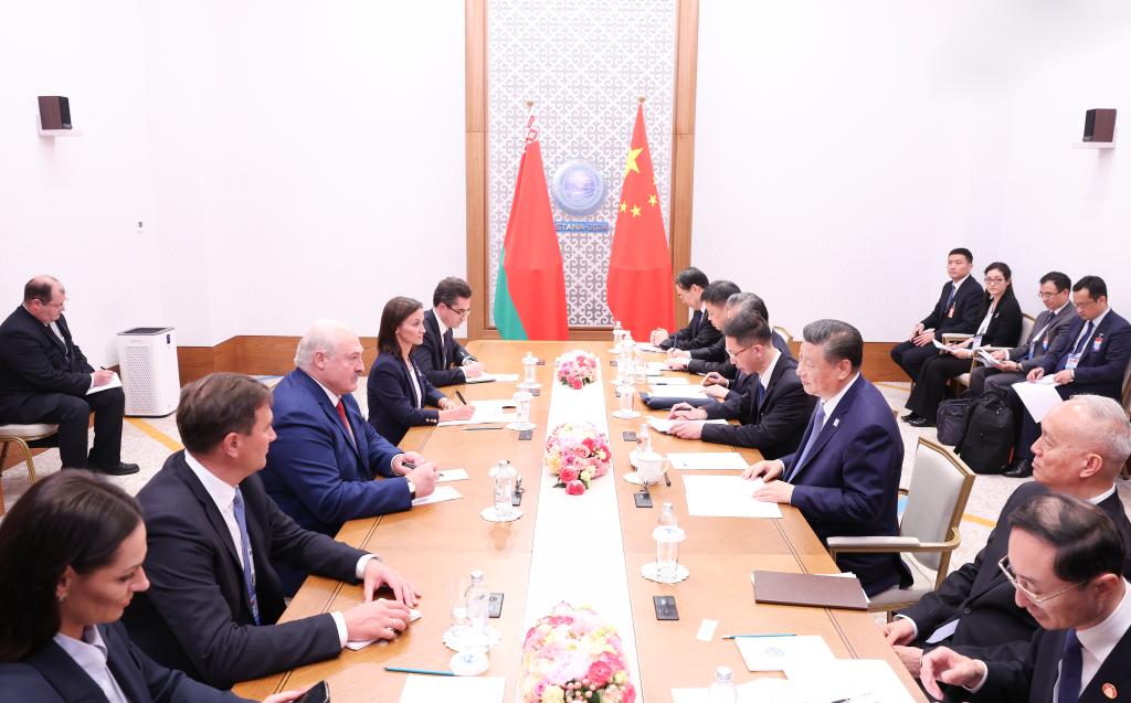 시진핑(習近平) 국가주석이 4일 오후(현지시간) 아스타나에서 열린 상하이협력기구(SCO) 정상회의 참석을 계기로 알렉산드르 루카셴코 벨라루스 대통령과 만났다. [촬영/신화사 기자 팡싱레이(龐興雷)]