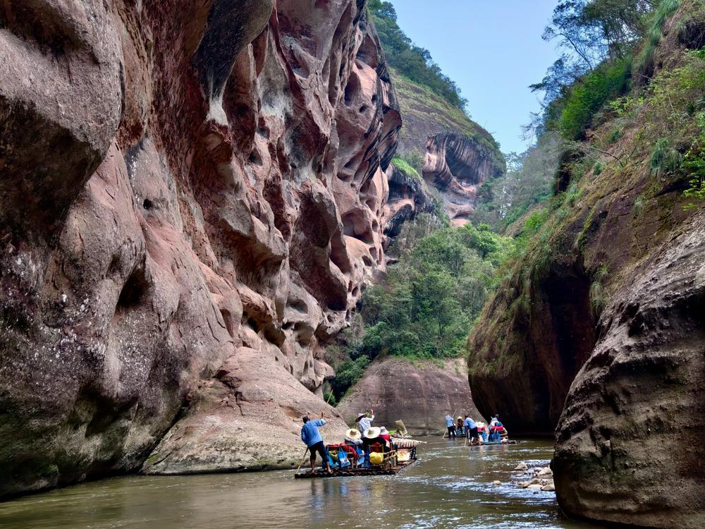 [신화망 싼밍 8월14일] 푸젠(福建)성 싼밍(三明)시를 찾은 관광객들이 11일 대나무 뗏목을 타고 상칭(上清)계곡의 절경을 감상하고 있다.