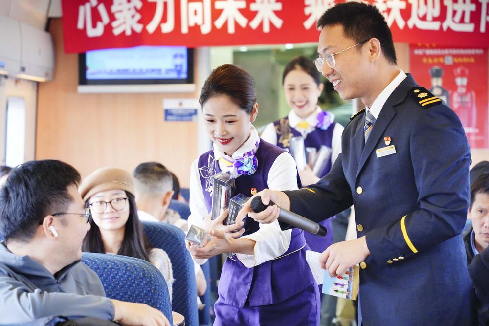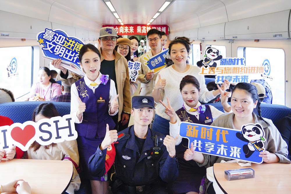 이날 D3205편 열차에서 올해 CIIE의 성공을 기원하는 관광객과 열차 승무원. 2024.10.28