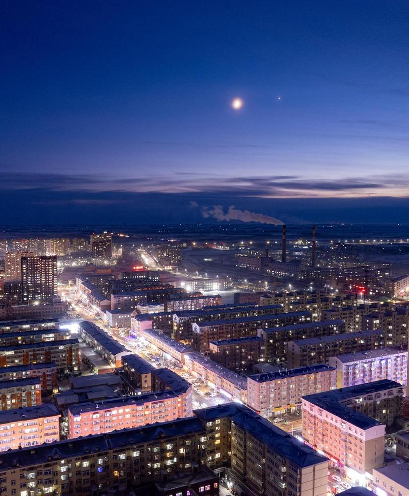 5일 헤이룽장(黑龍江)성 너허(訥河)시에서 드론으로 촬영한 금성과 달.