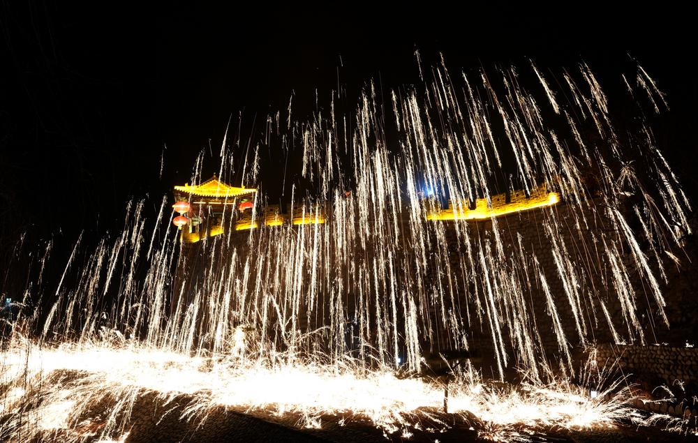 [신화망 징싱 2월4일]2일 민속 예술가들이 허베이(河北)성 스자좡(石家莊)시 징싱(井陘)현에 위치한 톈창쑹(天長宋) 고성에서 타철화(打鉄花) 공연을 펼치고 있다.