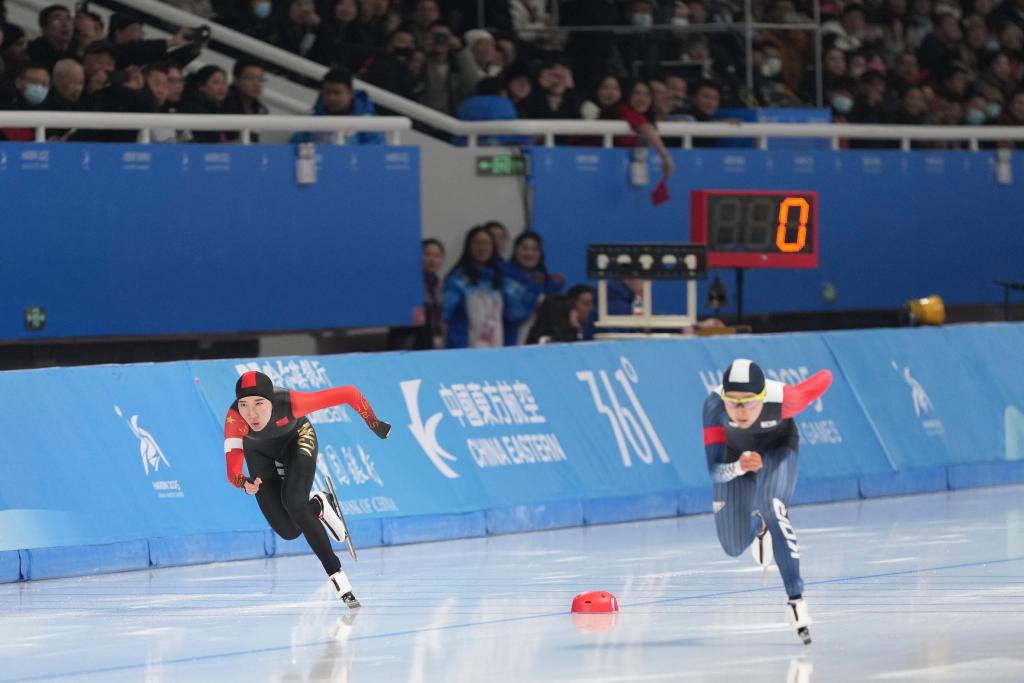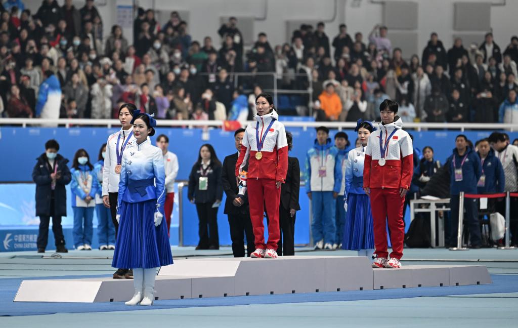 제9회 동계 아시안게임 스피드스케이팅 여자 1000m 결선이 11일 하얼빈에서 열렸다. 중국의 한메이(韓梅), 인치(殷琦) 선수가 각각 금메달과 은메달을 차지했다.