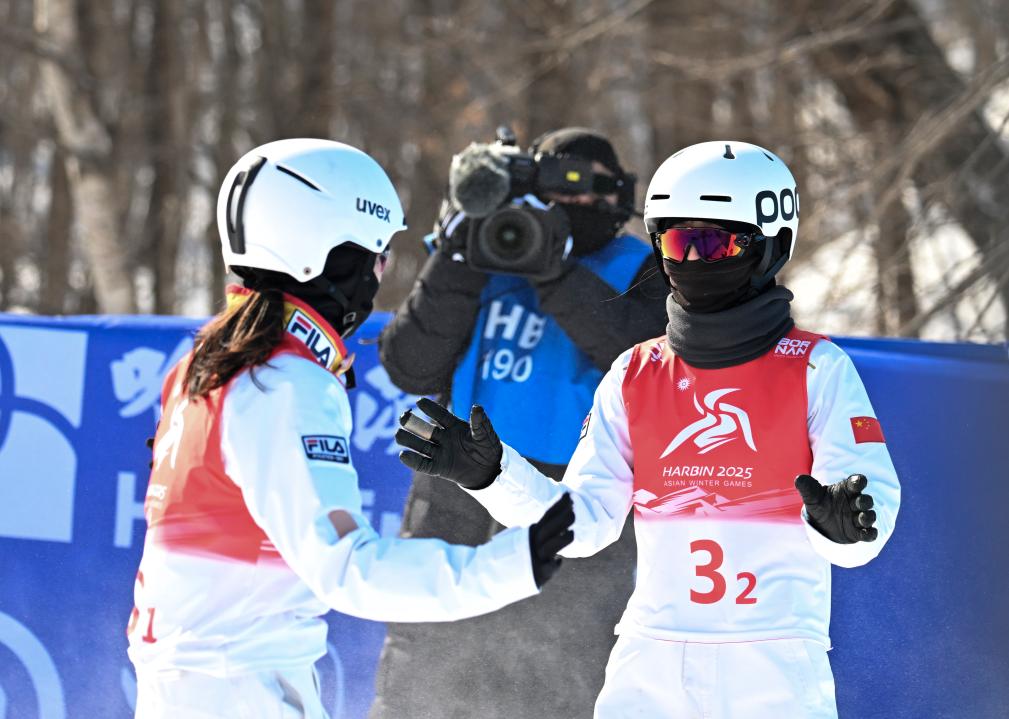 [신화망 야부리 2월12일] 제9회 동계 아시안게임 프리스타일 스키 여자 에어리얼 싱크로 결선이 11일 야부리에서 열렸다. 중국팀의 펑쥔시(馮俊熙)/왕쉐(王雪) 선수가 금메달을 땄다.pagebreak