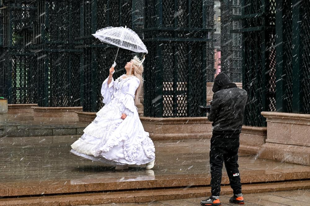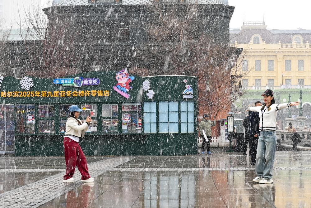 이날 하얼빈 건축예술광장에서 흩날리는 눈꽃을 배경으로 사진을 찍는 사람들. 2025.3.26
