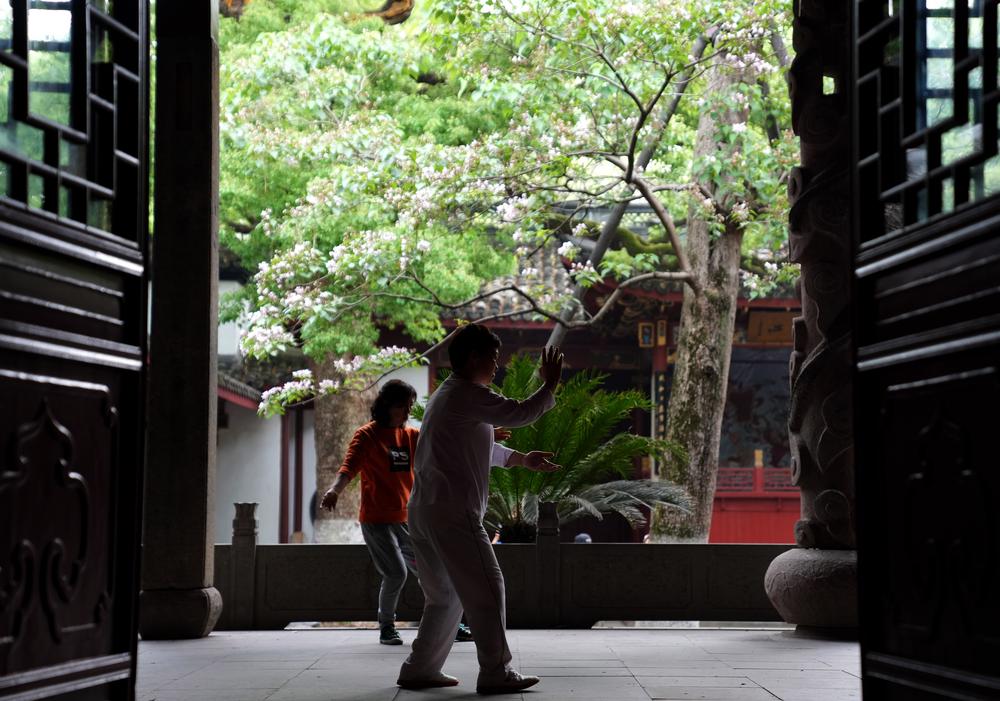 21일 저장(浙江)성 항저우(杭州) 우산(吳山) 관광지 내 꽃을 피운 고목나무 옆에서 아침 운동을 하는 시민.
