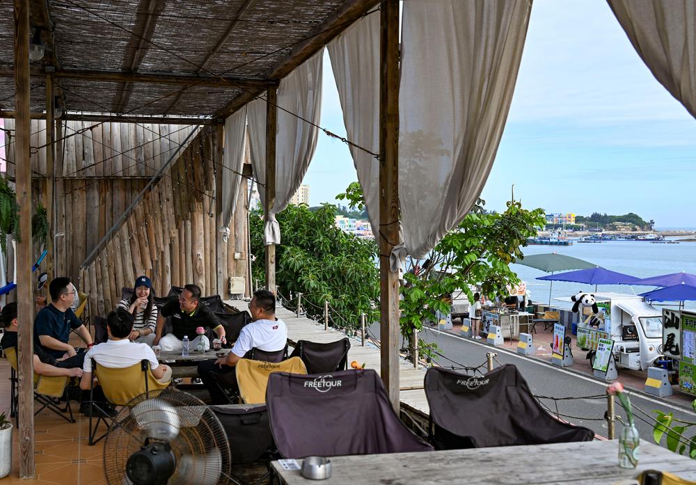 14일 광둥(廣東)성 산웨이(汕尾)시 훙하이완(紅海灣)에 위치한 한 카페에서 여유로운 시간을 보내는 여행객.