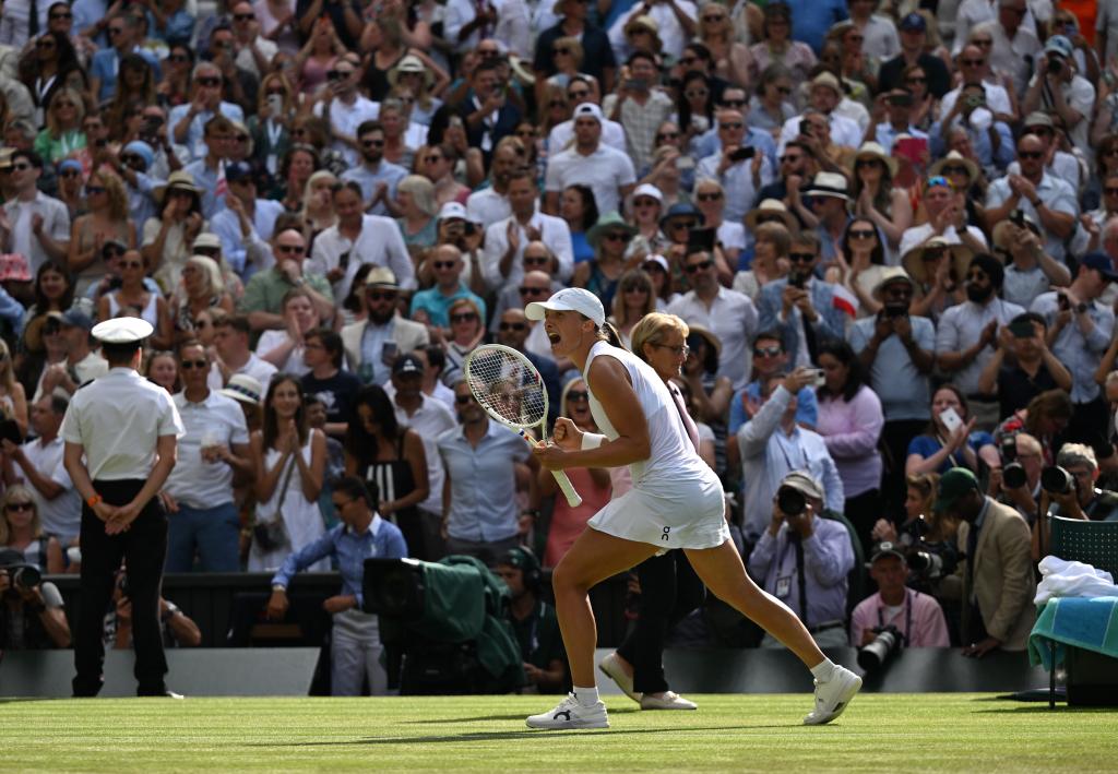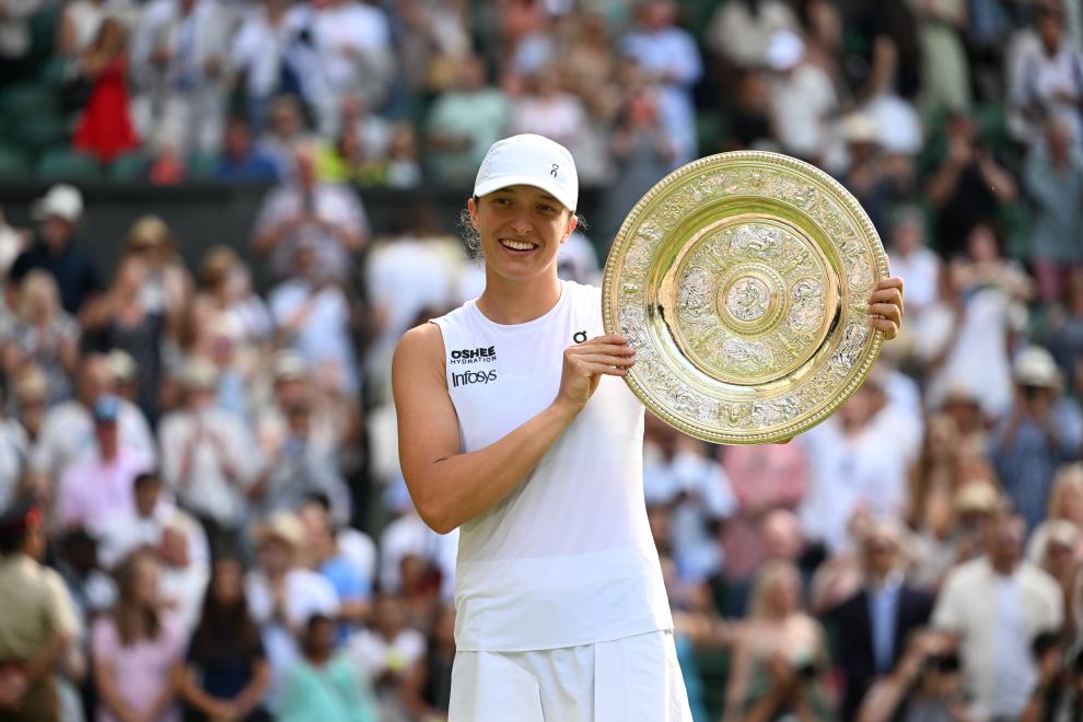 [신화망 런던 7월14일] 이가 시비옹테크가 12일(현지시간) 영국 런던에서 열린 2025 윔블던 테니스 대회 여자 단식 결승에서 어맨다 아니시모바(미국)를 2-1으로 완파하고 우승을 차지했다.[촬영/신화사 기자 자오딩저(趙丁喆)]