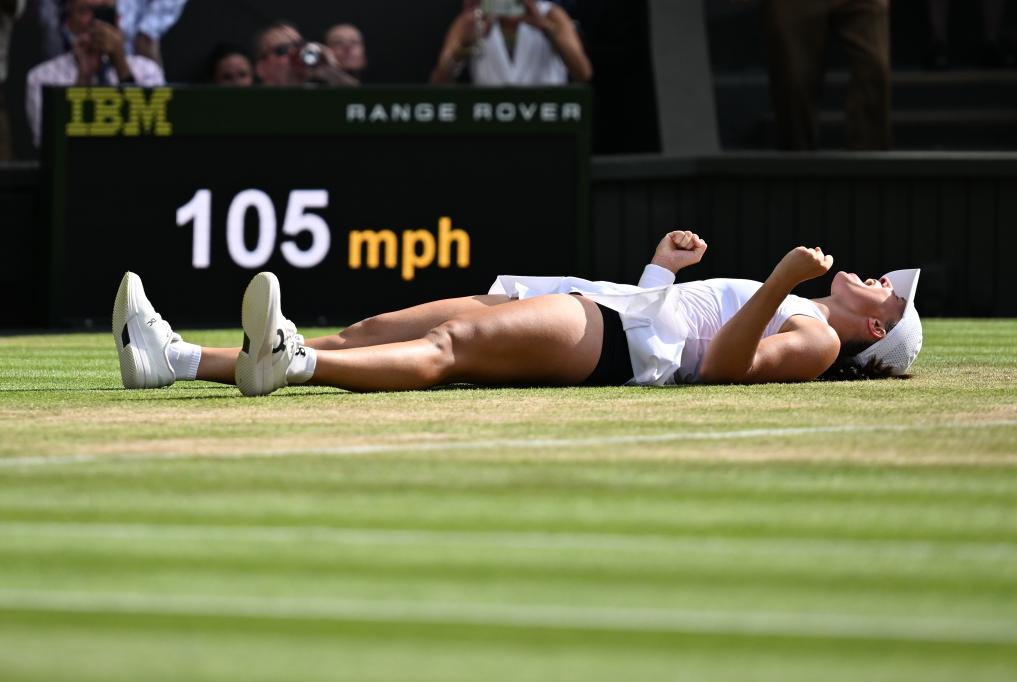 이가 시비옹테크가 12일(현지시간) 영국 런던에서 열린 2025 윔블던 테니스 대회 여자 단식 결승에서 어맨다 아니시모바(미국)를 2-1으로 완파하고 우승을 차지했다.[촬영/신화사 기자 자오딩저(趙丁喆)]