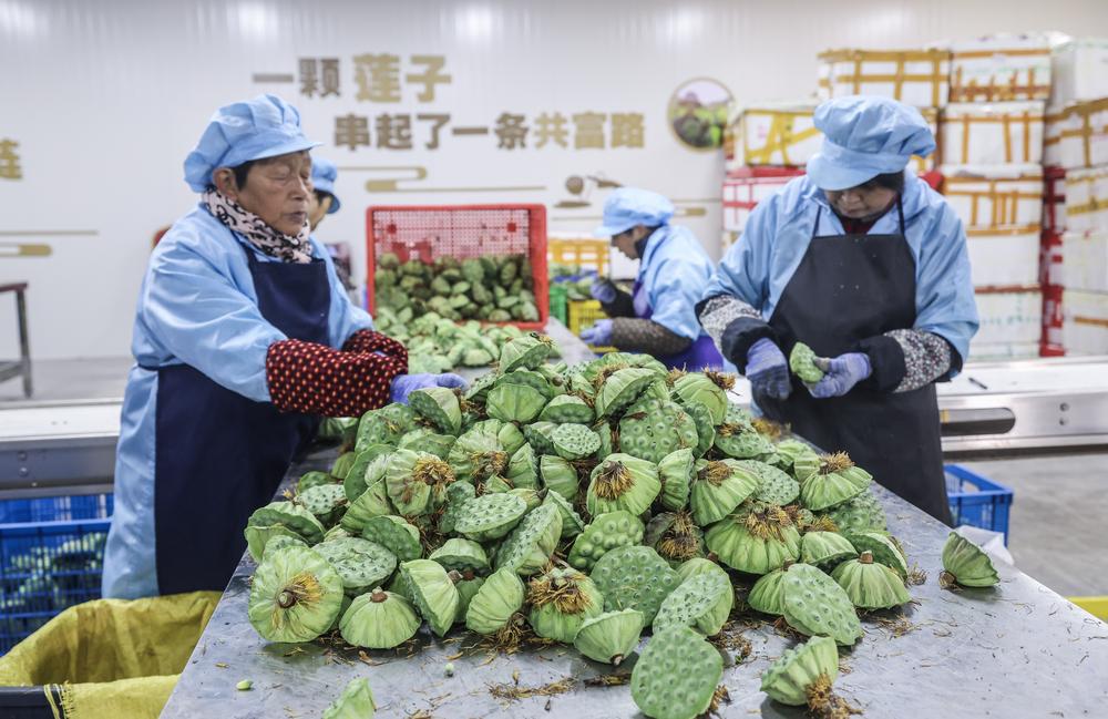 18일 저장(浙江)성 젠더(建德)시 다츠옌(大慈岩)진 연밥 공동부유 공방에서 농민이 연방을 선별하고 있다.
