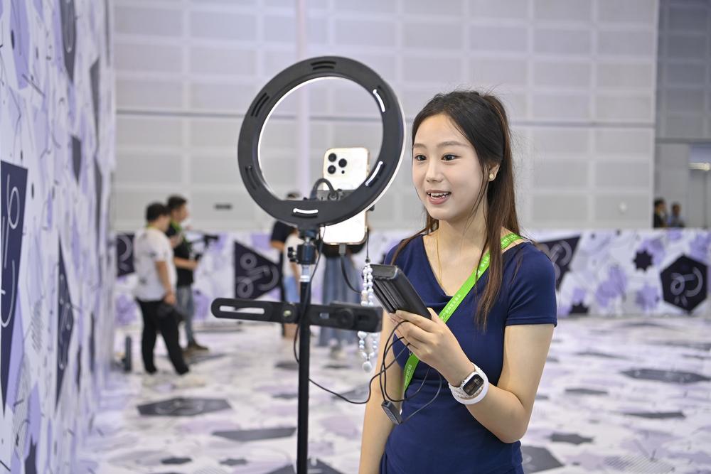 작업자가 21일 '제7회 산시(山西) 문화산업 박람교역회'에서 라이브 방송을 진행하고 있다.