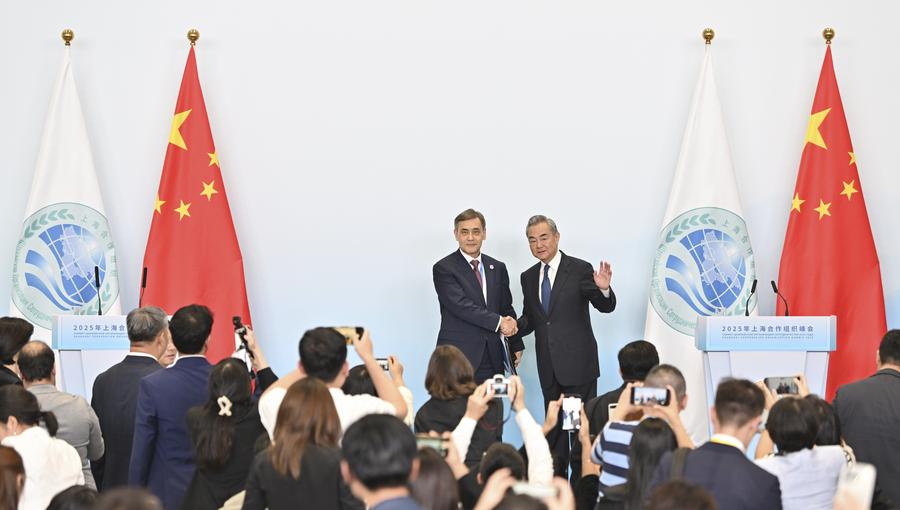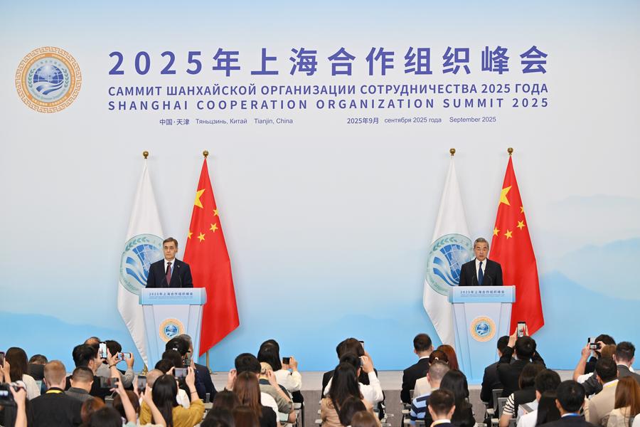 [신화망 톈진 9월2일] 1일'상하이협력기구(SCO) 톈진(天津) 정상회의'가 끝날 무렵 왕이(王毅) 중국공산당 중앙정치국 위원이자 외교부장이 정상회의 미디어센터에서 누를란 예르멕바예프 SCO 사무총장과 공동 기자회견을 가지고 중국 내외신 기자들의 질문에 답했다.