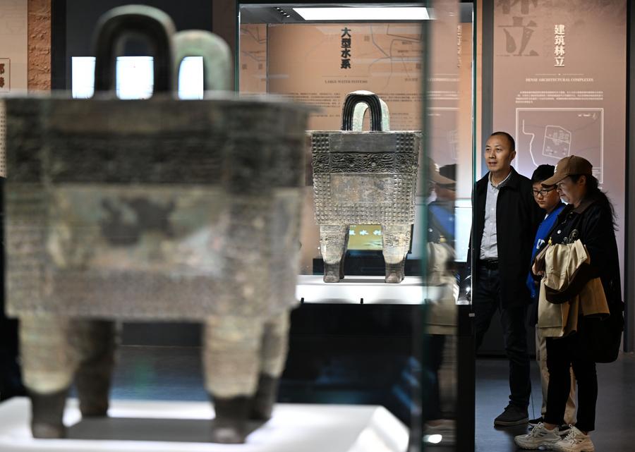3일 관광객들이 정저우(鄭州) 상대(商代)도성유적박물원에서 열린 '정저우 상대도성 발굴 70주년 기념 고고학 발굴 전시회'에서 두링(杜嶺) 1호 방정(方鼎·사각형 솥)을 관람하고 있다. (사진/신화통신)